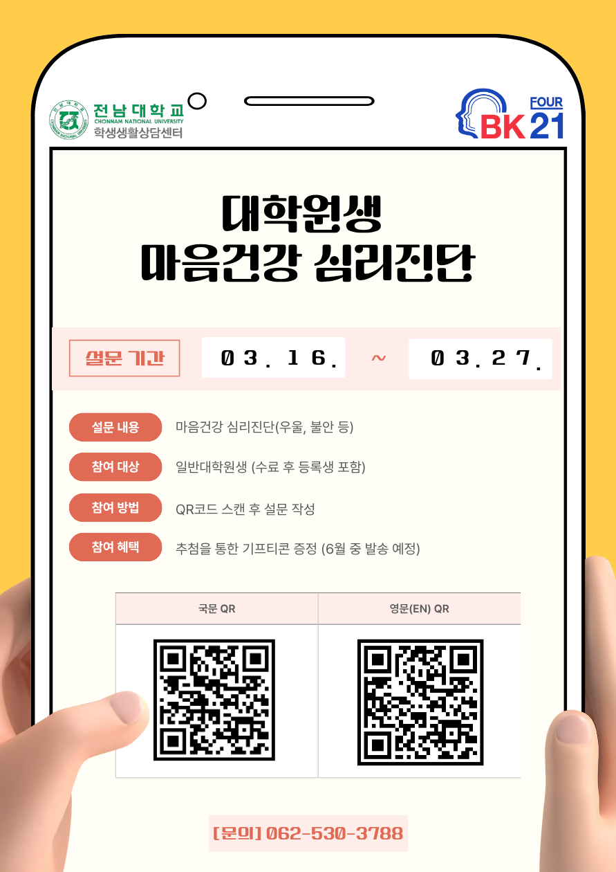 대학원생의 마음건강 현황을 파악하기 위한 마음건강 심리진단을 시행합니다.