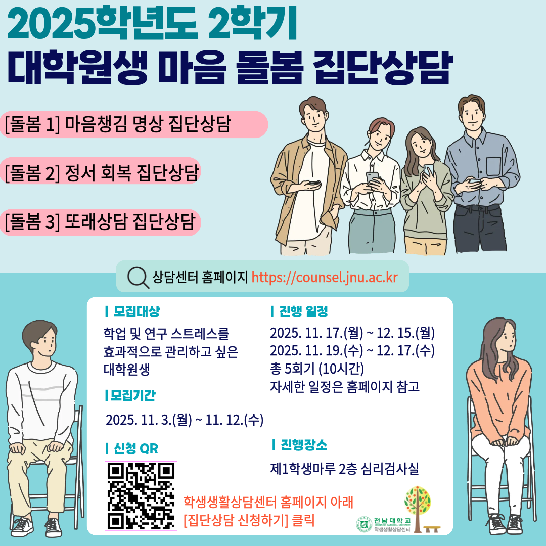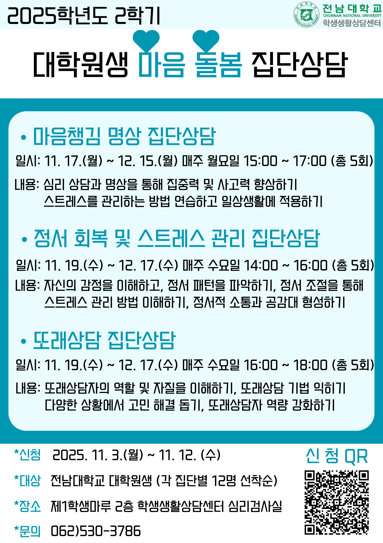 fnctId=bbs,fnctNo=2012 글번호 937759 2025학년도 2학기 대학원생 마음건강증진 집단상담 운영 안내 작성일 2025.10.23 수정일 2025.11.03 작성자 학생생활상담센터 조회수 290 첨부파일 첨부파일이(가) 없습니다. RSS 2.0 총 219 개의 게시물이 있습니다. 게시물 검색 제목 작성자 게시글 리스트 게시판 - 공지사항 번호 제목 작성자 작성일 조회수 첨부파일 전체게시판공지 2025학년도 하반기 전남대학교 학생생활상담센터 전문상담인력 계약직원 채용시험 공고 학생생활상담센터 2025.11.13 95 일반공지 [카드뉴스] 교내 휴식 공간 소개 학생생활상담센터 2025.07.18 353 전체게시판공지 개인상담 온라인 신청 안내 학생생활상담센터 2025.04.02 3561 일반공지 [카드뉴스] 2025학년도 학생생활상담센터 이용안내 학생생활상담센터 2024.03.05 4287 219 2025학년도 하반기 전남대학교 학생생활상담센터 전문상담인력 계약직원 채용시험 공고 새글 학생생활상담센터 2025.11.13 95 218 [카드뉴스] 마인드서포터즈 활동 안내 학생생활상담센터 2025.11.11 76 217 2025학년도 2학기 대학원생 마음건강증진 집단상담 운영 안내 학생생활상담센터 2025.10.23 290 216 2025힉년도 2학기 학생생활상담센터 마음건강 교육 안내 학생생활상담센터 2025.10.17 351 215 2025학년도 2학기 학업동기향상 집단상담 운영 안내 학생생활상담센터 2025.10.17 240 214 2025학년도 대학원생 대상 마음건강 심리진단 및 수요조사 안내 학생생활상담센터 2025.09.10 454 213 2025학년도 2학기 학생생활상담센터 인턴상담원 선발 결과 학생생활상담센터 2025.08.26 432 212 2025년 전국민 마음투자 지원사업 신청 접수 중단 안내 학생생활상담센터 2025.08.13 600 211 2025학년도 2학기 학생생활상담센터 인턴상담원 선발 공고 학생생활상담센터 2025.08.11 635 210 2025학년도 2학기 마인드서포터즈 운영 안내 학생생활상담센터 2025.08.08 625 처음 122 1 2 3 4 5 6 7 8 9 10 다음 페이지 다음 끝