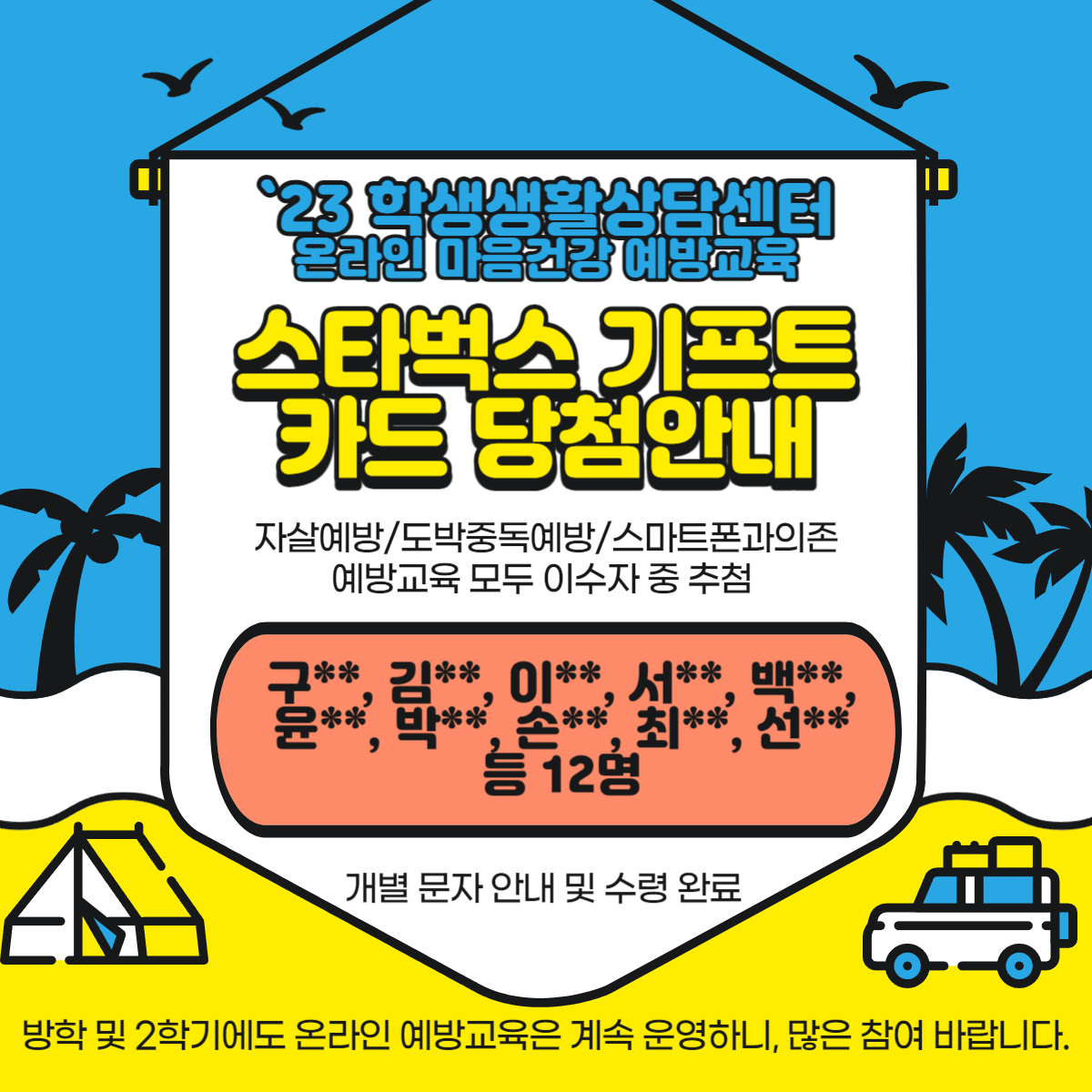 '23학년도 1학기 온라인 마음건강 예방교육(자살예방교육, 도박문제예방교육, 스마트폰과의존 예방교육)을 모두 이수한 학생 중 추첨을 통해 스타벅스 기프트카드를 증정했습니다.